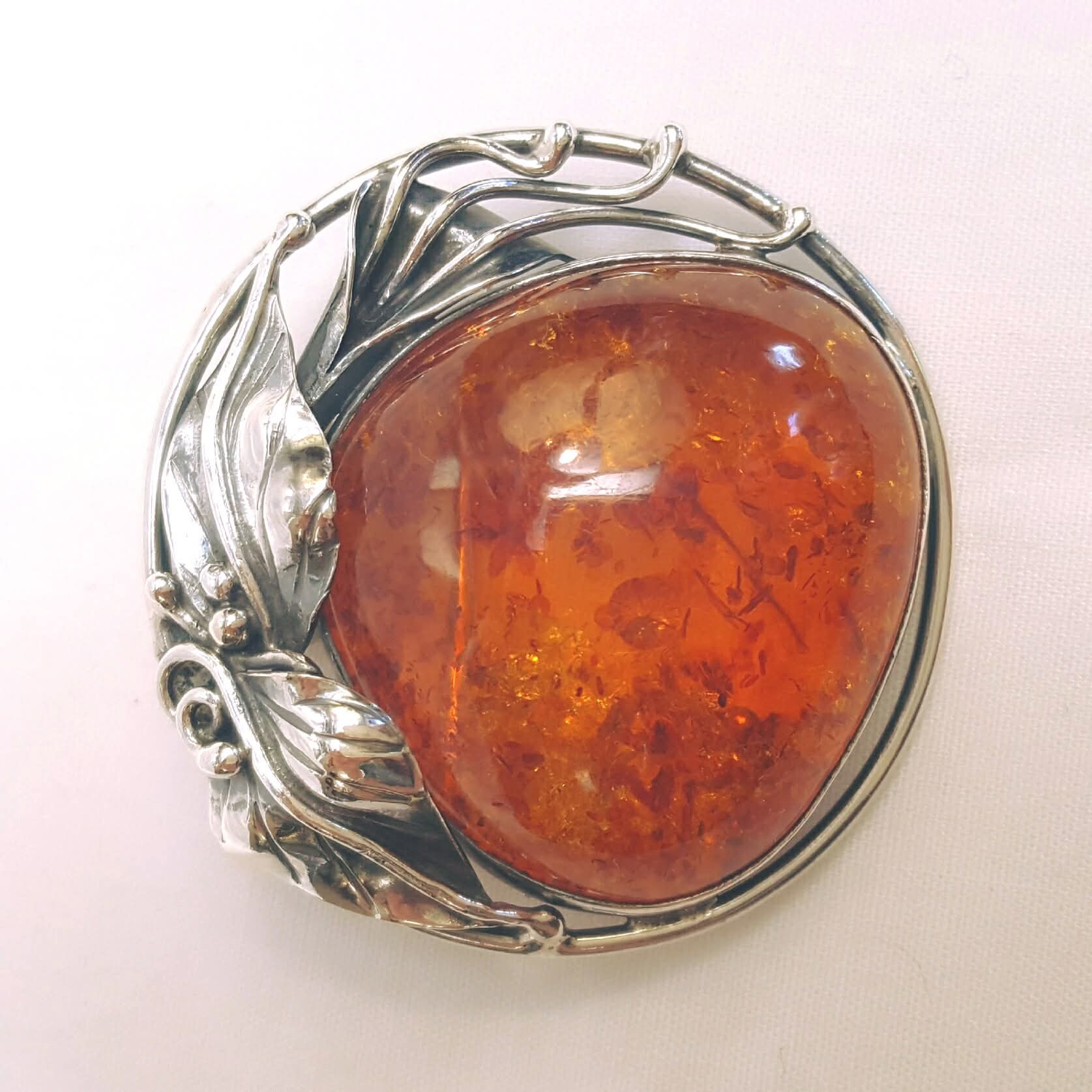 At 45mm in diameter and weighing 15 grams, this is a brooch of real presence — substantial enough to anchor a lapel, collar, or scarf with genuine authority, yet refined enough in its execution to wear with elegance rather than statement. The reverse carries a sturdy pin fitting in good working order. The condition throughout is excellent, with the silver retaining good colour and detail, and the amber surface polished and bright with no chips or damage.