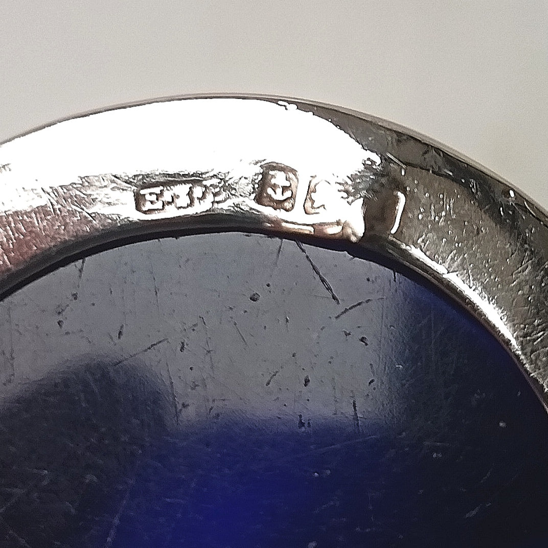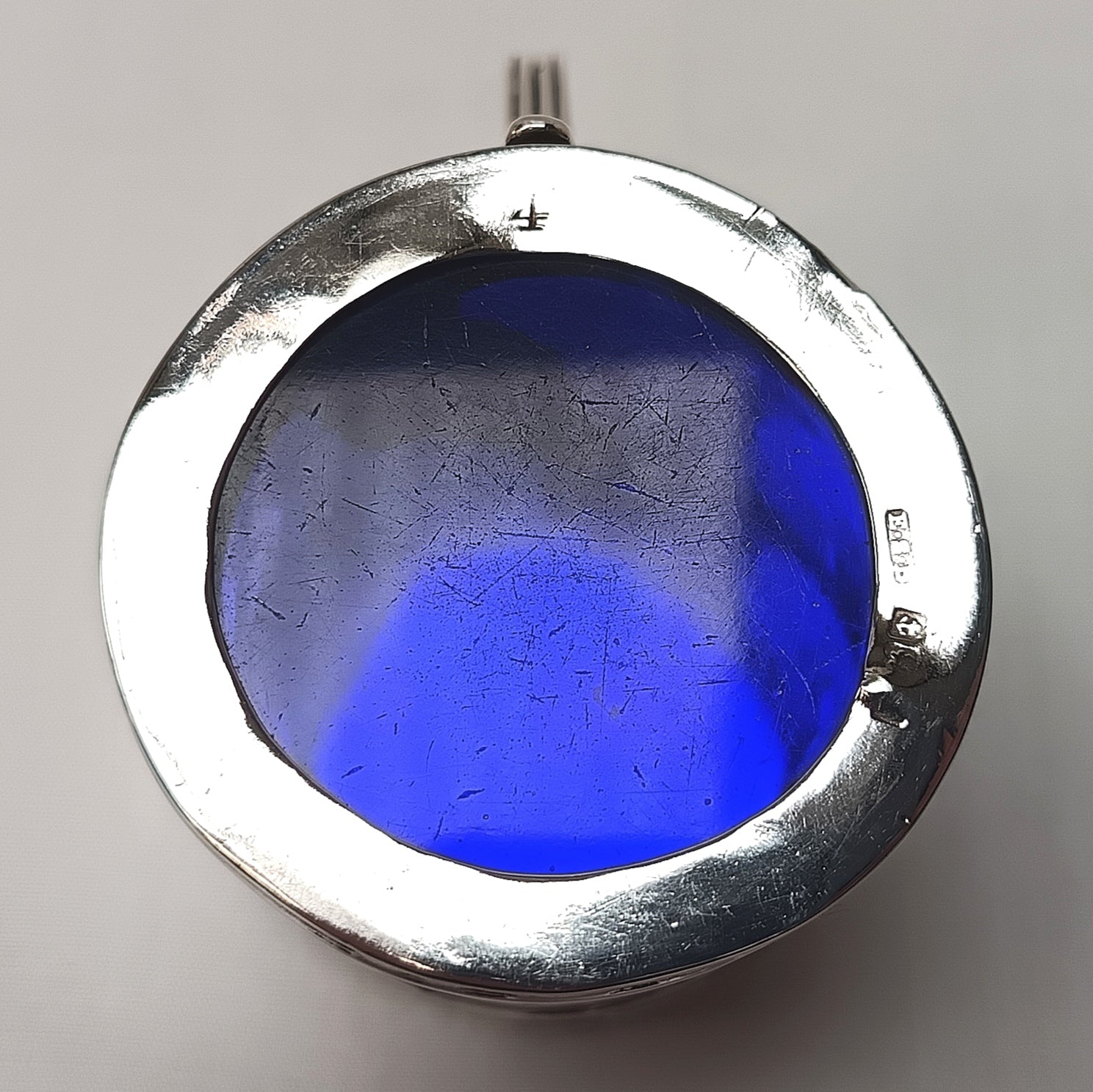 The cellar retains its original Bristol blue glass liner — a striking and highly desirable feature that adds rich colour and authenticity. The vivid blue glass contrasts beautifully with the polished sterling silver, making this piece as decorative as it is functional.