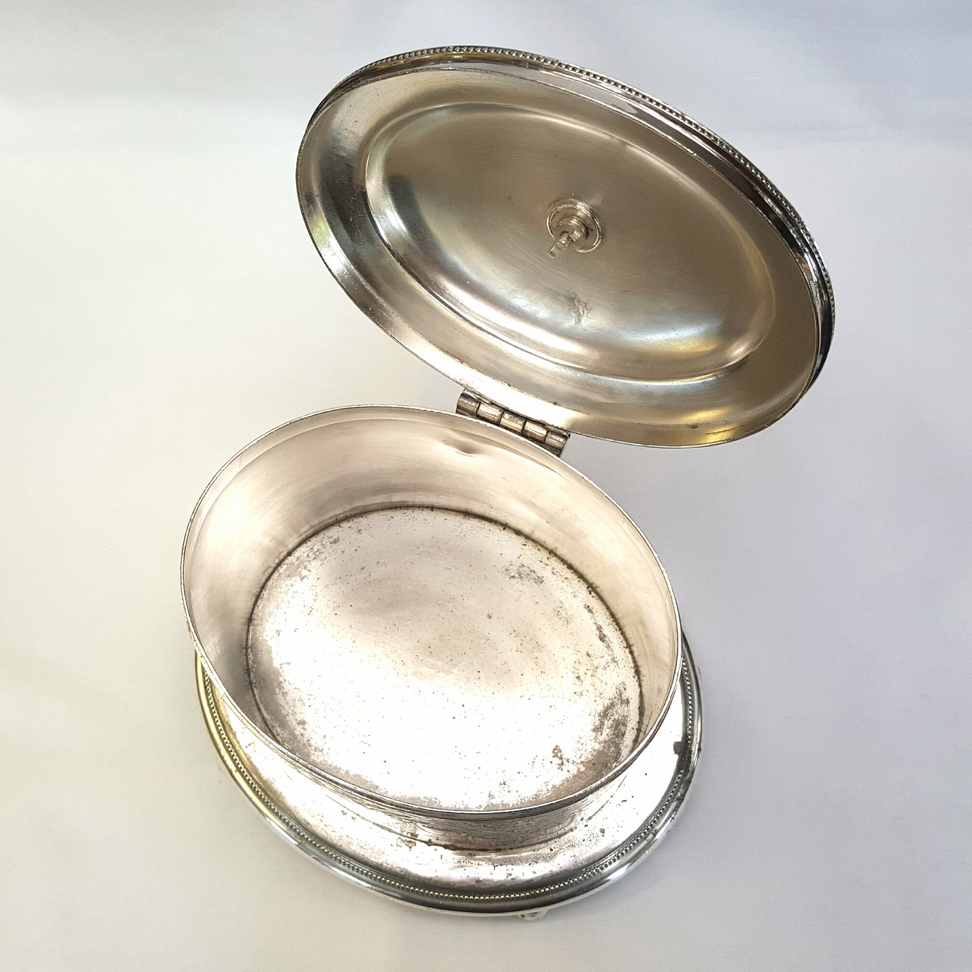 The hinged lid, complete with a delicate finial, rests gracefully on an attached four-footed base, combining both functionality and decorative appeal.