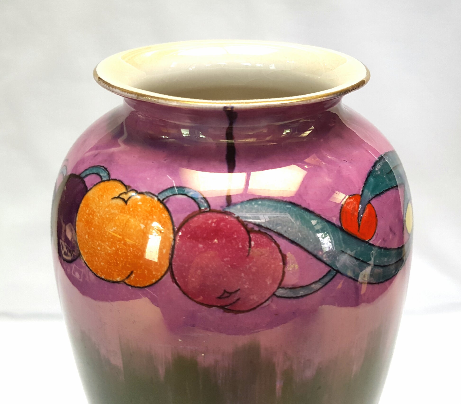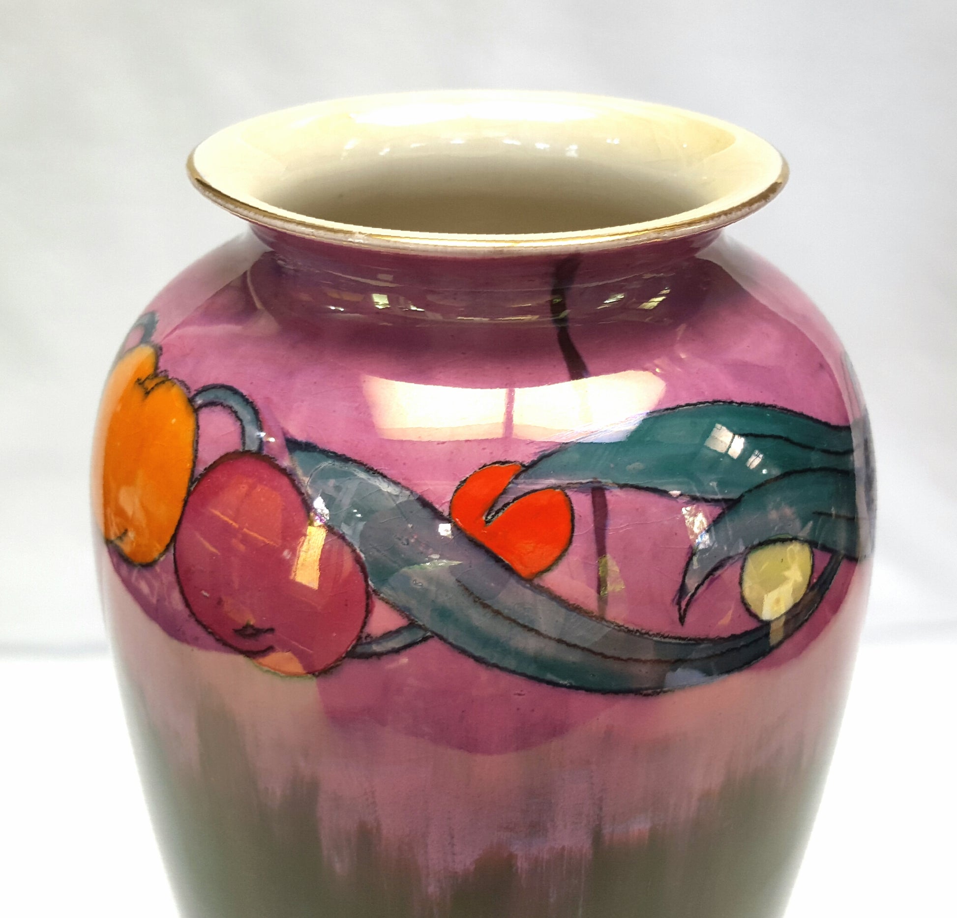 The piece features a beautifully applied lustre glaze and a vibrant, hand-decorated plum motif, creating a striking interplay of color and texture typical of the period’s decorative style.