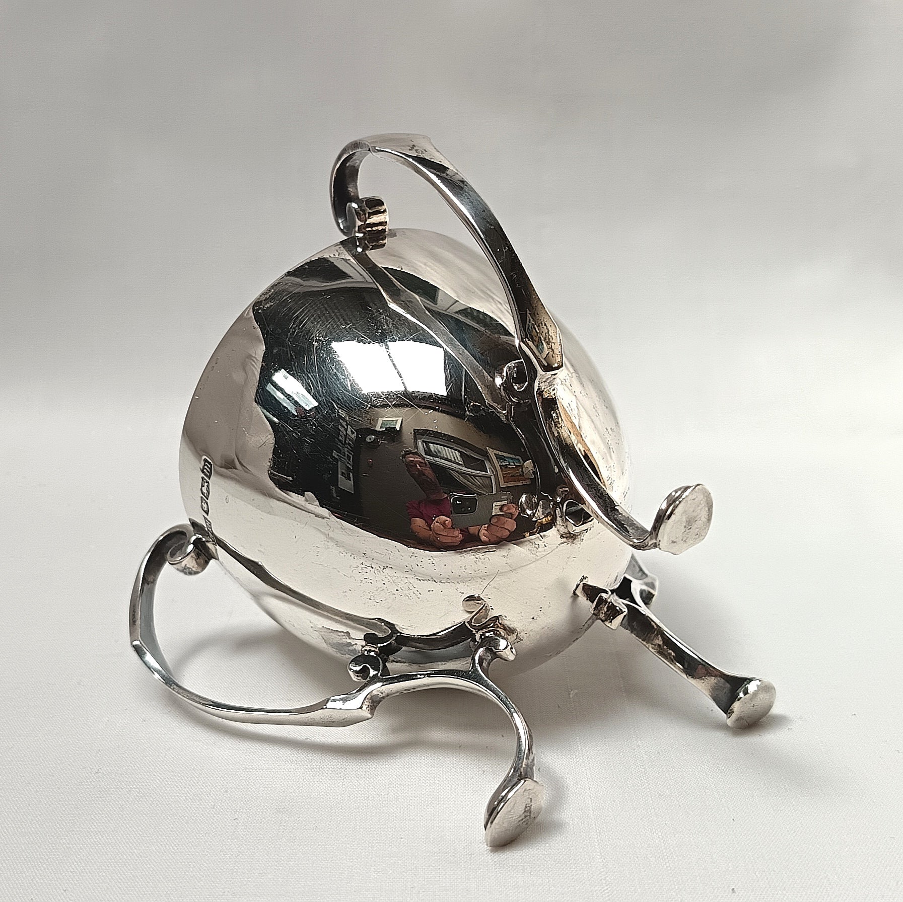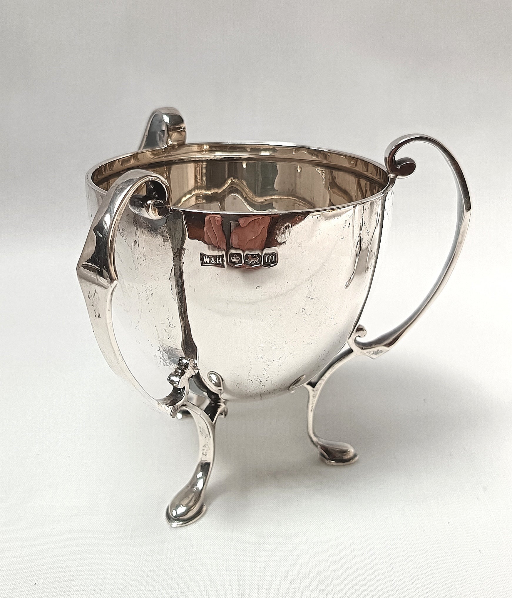 A striking example of Art Deco English silver, this near-antique tyg or loving cup combines form, function, and decorative elegance. Crafted by the renowned silversmiths Walker & Hall in Sheffield, 1929, the piece is beautifully egg-shaped with gracefully scrolling handles, delicate legs, and pad feet — a classic motif of the period that reflects the geometric sophistication of Art Deco design.