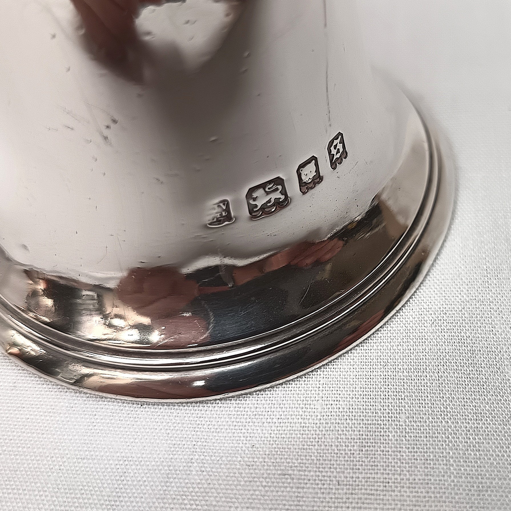 A beautifully crafted near-antique Sterling silver table or service bell, hallmarked for CJ Vander Ltd, London, 1933. This elegant piece showcases the fine craftsmanship and attention to detail that CJ Vander was known for during the early 20th century. The bell features a gracefully slender stem, slightly leaning to one side, adding a subtle charm and character to its presence.