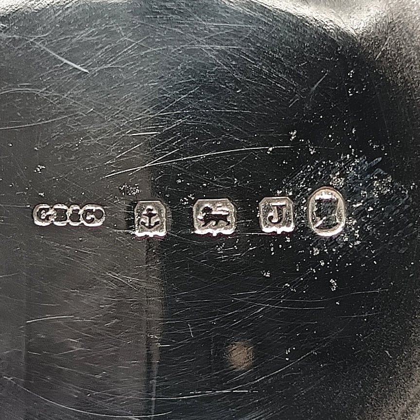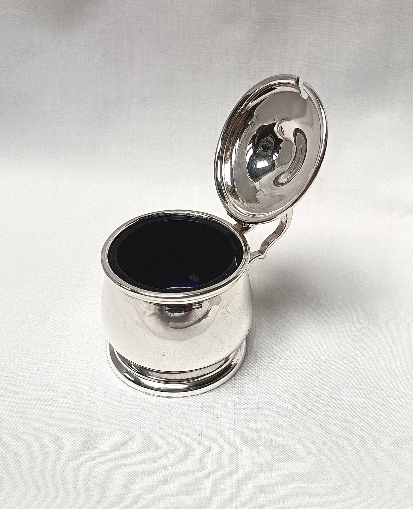 A charming example of early 20th-century English silver, this near-antique hallmarked sterling silver lidded salt cellar exudes elegance and craftsmanship. The piece features its original Bristol blue glass liner, offering a striking contrast to the gleaming silver exterior. Crafted by G Bryan & Co, a distinguished Birmingham silversmith renowned for fine silver tableware, this item is a testament to the high standards of English silvermaking in the 1930s.