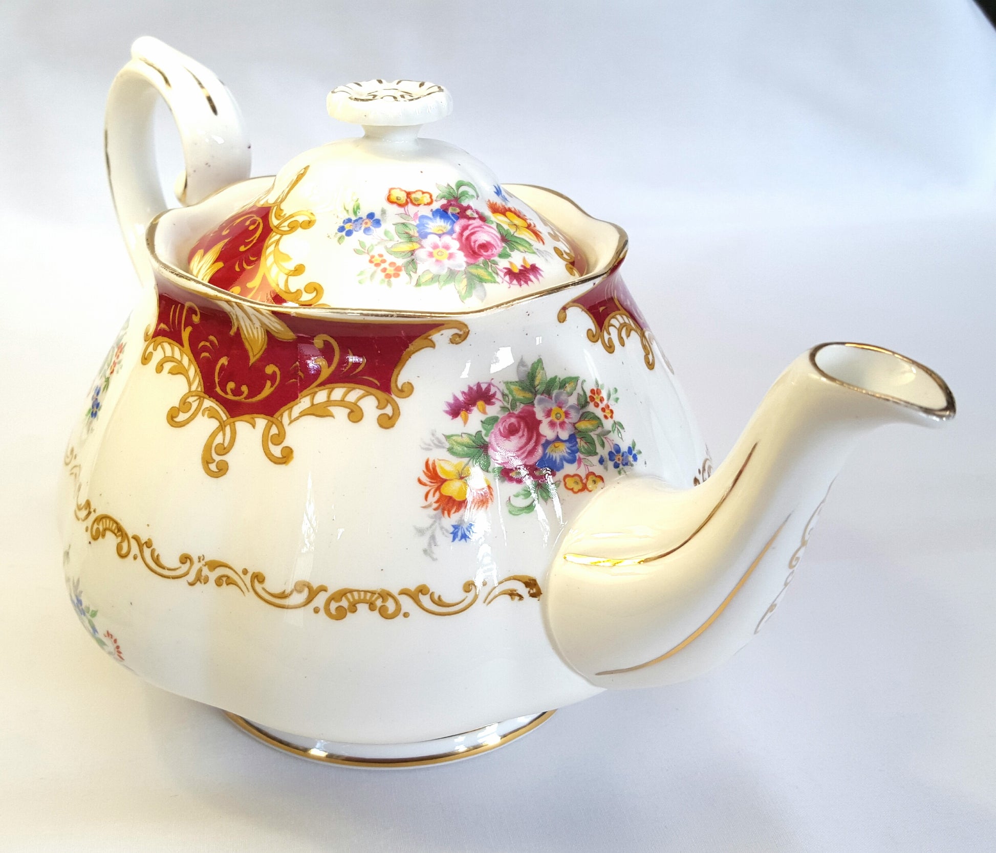 The teapot’s graceful curves, delicate spout, and elegantly shaped handle are complemented by subtle gilded accents, adding a touch of sophistication and classic English charm.